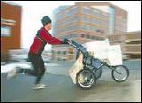 A carrier for three months, Mr. Brake first delivered the morning paper while running with pouches draped over each of his shoulders. That required him to keep refilling the pouches, however, so he has since come up with a more convenient, and certainly ingenious, method. Mr. Brake now makes deliveries while running behind a jogging stroller that he rigged for the purpose.